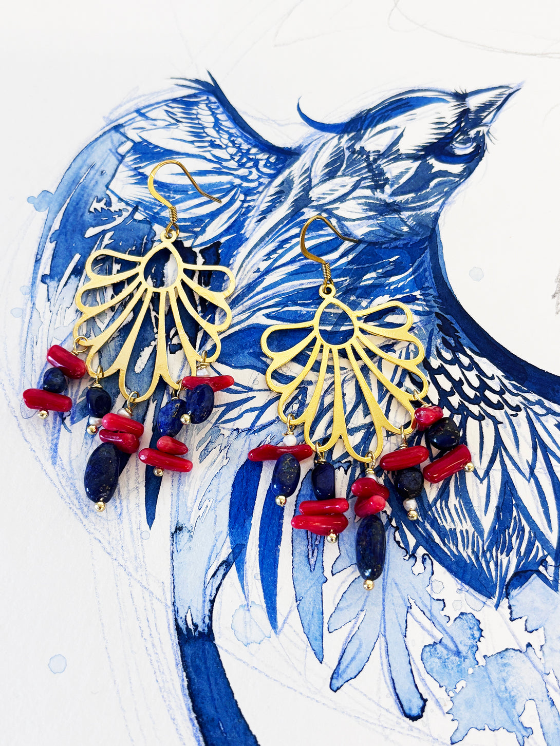 Gold Scallop Earrings with Lapis & Coral | Queen Magpie