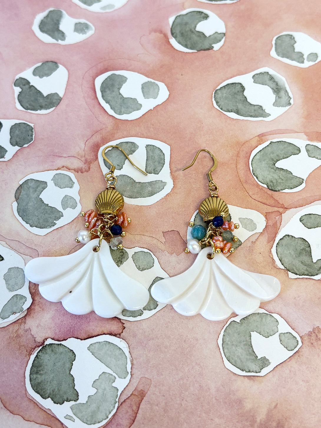 Mother of pearl earrings with 22ct gold plated brass, shell, pearls, and assorted gemstones. Perfect for a touch of seaside magic all season.